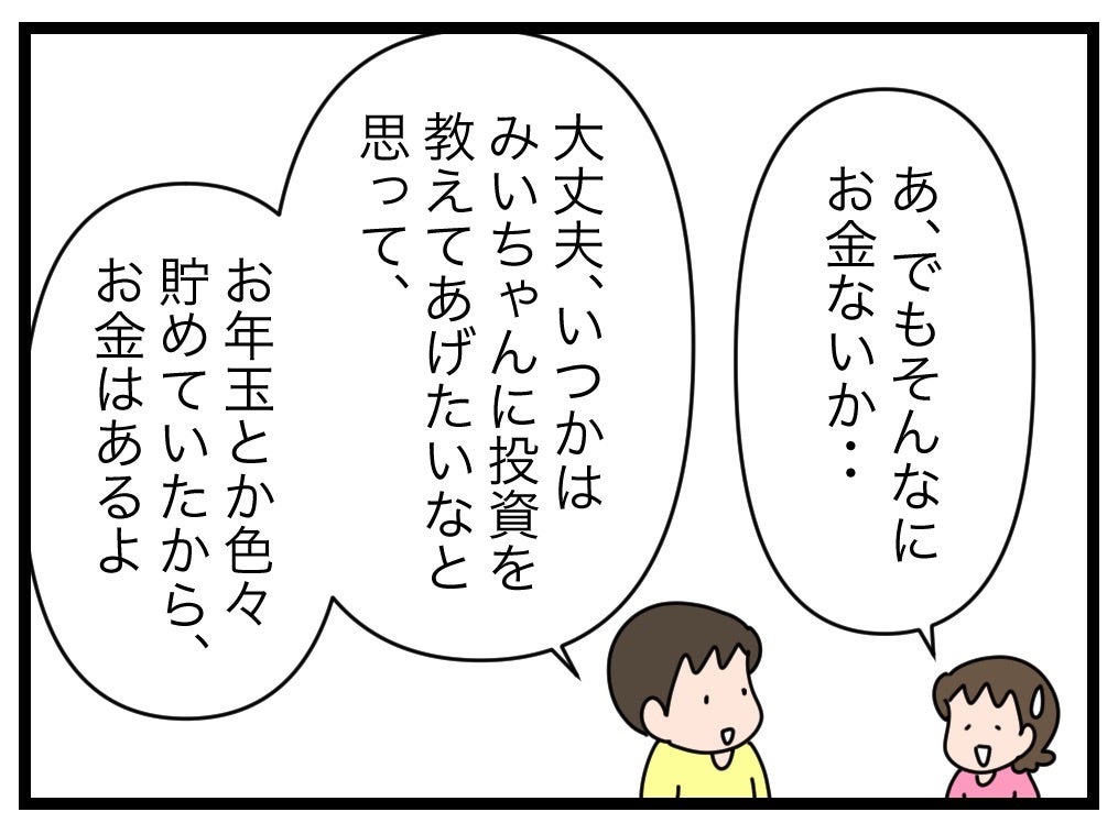 お金の教育 小学2年生が投資を始めた話 きっかけ編 その3 2021.12.20 子育て いつも読んでいただき、有難うございます。 広告 広告 0 コメントはこちら 同じカテゴリの記事 「家族で議論」がおもしろい! たたくなら… 何十年かぶりにプラネタリウムに行ったらとってもよかった話 「痛いの痛いの飛んでいけ」の効果的なやり方 国語の読解問題の採点でモヤモヤした話 その3 国語の読解問題の採点でモヤモヤした話 その2 国語の読解問題の採点でモヤモヤした話 その1 2歳児とお出かけ待ち時間に便利アイテム 心からオススメ!おうち勉強法の本 子どもが小学生になってまず覚えさせたこと 実録!小学生のいる共働き家庭の夏休みの過ごし方 その12 実録!小学生のいる共働き家庭の夏休みの過ごし方 その11 実録!小学生のいる共働き家庭の夏休みの過ごし方 その10 実録!小学生のいる共働き家庭の夏休みの過ごし方 その9 実録!小学生のいる共働き家庭の夏休みの過ごし方 その8 子どもの「ウソ」をやめさせたい!一発で効いた母の一言 実録!小学生のいる共働き家庭の夏休みの過ごし方 その7 実録!小学生のいる共働き家庭の夏休みの過ごし方 その6 実録!小学生のいる共働き家庭の夏休みの過ごし方 その5 小学2年生が1,000円のオムライスセットを販売!本物のお店も経営できる? 実録!小学生のいる共働き家庭の夏休みの過ごし方 その4 実録!小学生のいる共働き家庭の夏休みの過ごし方 その3 実録!小学生のいる共働き家庭の夏休みの過ごし方 その2 実録!小学生のいる共働き家庭の夏休みの過ごし方 その1 小学2年生がカフェに挑戦。ものすごく頑張ったのに利益ご少ない!? 算数とアスパラベーコン 英語を勉強する前に知っておきたかったことを子どもに伝えてみた話 その5 英語を勉強する前に知っておきたかったことを子どもに伝えてみた話 その4 小学2年生が家庭内起業で大儲け!小さな仕事は頑張らなくなる? 英語を勉強する前に知っておきたかったことを子どもに伝えてみた話 その3 英語を勉強する前に知っておきたかったことを子どもに伝えてみた話 その2 英語を勉強する前に知っておきたかったことを子どもに伝えてみた話 その1 家族で漢字検定を受検しました その7 小学2年生の家庭内起業。雇ったアルバイトが途中で逃げ出した!? 家族で漢字検定を受検しました その6 小学2年生が家庭内起業で初めて出した利益は1847円。客も店もみんなハッピーに! 家族で漢字検定を受検しました その5 家族で漢字検定を受検しました その4 家族で漢字検定を受検しました その3 小学2年生のおうち起業。7歳児が2時間半かけて一人で作ったランチが凄かった!(お金の教育26) 家族で漢字検定を受検しました その2 家族で漢字検定を受検しました その1 小学2年生が経営するレストラン。ランチの値段決めが予想以上に難しかった!! 空前の日本史ブーム到来!! 選挙の投票に子ども達と行った話 その4 選挙の投票に子ども達と行った話 その3 選挙の投票に子ども達と行った話 その2 小学2年生の家庭内起業。レストランのランチ価格がとんでもないことに!(お金の教育24) 選挙の投票に子ども達と行った話 その1 小学2年生が家庭内起業!!おうちレストラン、始めました(お金の教育23) 自主学ノートで楽しく学ぼう その5 自主学ノートで楽しく学ぼう その4 自主学ノートで楽しく学ぼう その3 小学2年生がおうちでレストラン経営にチャレンジ!? お金の教育22 自主学ノートで楽しく学ぼう その2 自主学ノートで楽しく学ぼう その1 忙しくてもイライラしても、愛が伝わる「魔法の言葉」(with online) キュンです!2歳児の言い間違い リビングで楽しく学ぶ地理 その3 ワーママ「ここぞ」の朝対応 その4 お金の教育21 学校斡旋の習字セットを買わないことで娘が学んだ「お金の使い方」 ワーママ「ここぞ」の朝対応 その3 ワーママ「ここぞ」の朝対応 その2 ワーママ「ここぞ」の朝対応 その1 お金の教育19 どうする⁉︎子どもの絵の具セット選び…大切なのは「自分で選択すること」だった 我が家のゲーセン事情 その3 我が家のゲーセン事情 その2 我が家のゲーセン事情 その1 お金の教育18 学校で使う絵の具セット「値段は妥当?」「親が買うのが当たり前?」 育休復帰の思わぬ壁 その16 育休復帰の思わぬ壁 その15 育休復帰の思わぬ壁 その14 育休復帰の思わぬ壁 その13 お金の教育17 大人でも難しい⁉︎5歳児が「お金をためて欲しいおもちゃを買う」経験が想像以上に… 育休復帰の思わぬ壁 その12 育休復帰の思わぬ壁 その11 育休復帰の思わぬ壁 その10 育休復帰の思わぬ壁 その9 お金の教育16 欲しい物のために頑張る5歳児!大きな目標が浪費ぐせを変えた!? 育休復帰の思わぬ壁 その8 育休復帰の思わぬ壁 その7 育休復帰の思わぬ壁 その6 育休復帰の思わぬ壁 その5 お金の教育15 さっきあったお金が、なぜもう無いのか?それはね…(with online) 育休復帰の思わぬ壁 その4 育休復帰の思わぬ壁 その3 育休復帰の思わぬ壁 その2 育休復帰の思わぬ壁 その1 古いデジカメの使い方 お金の教育14 子ど