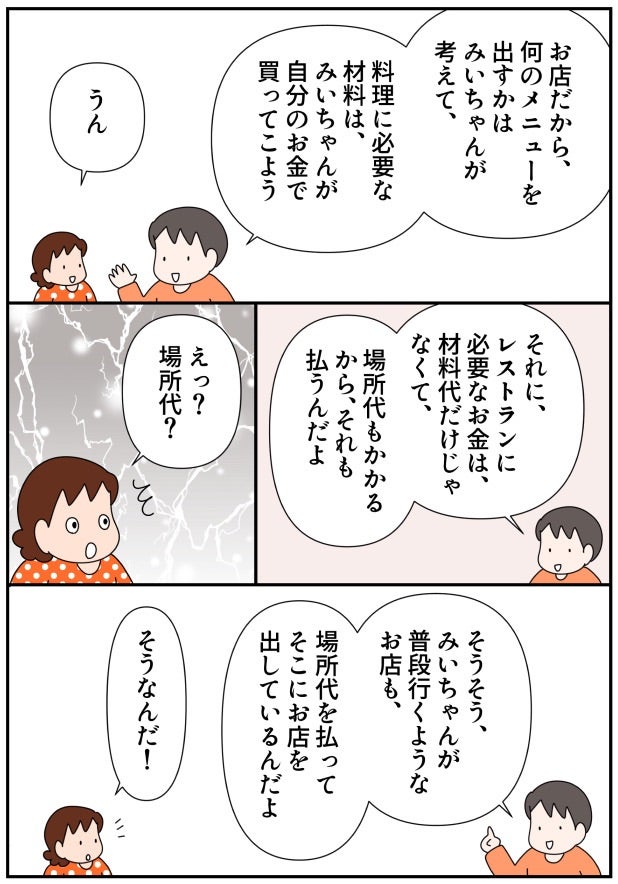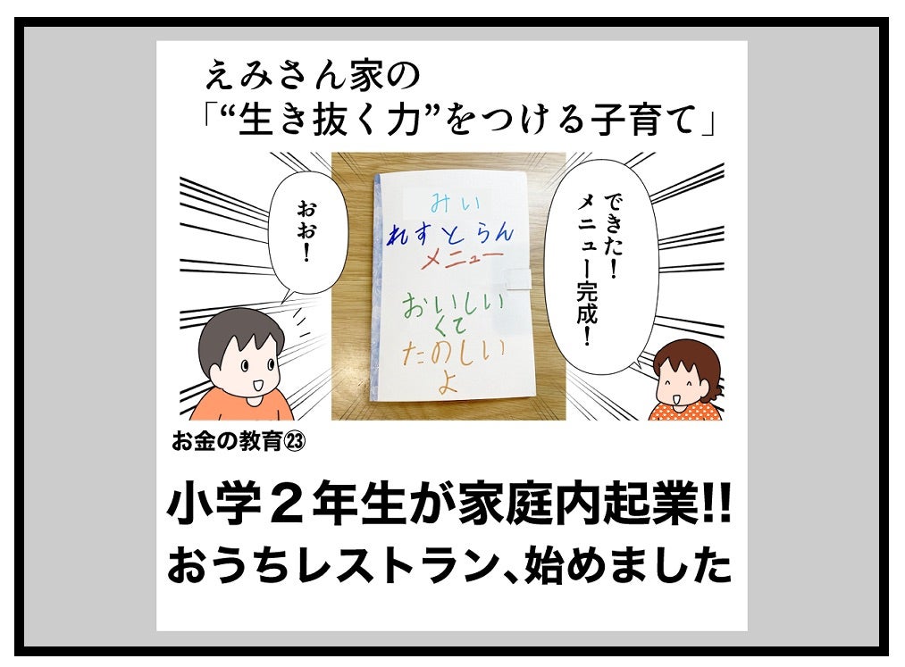 小学2年生が家庭内起業!!おうちレストラン、始めました(お金の教育23) 2022.07.13 子育て いつも読んでいただき、有難うございます。 広告 ↓続きはこちら 小学2年生が家庭内起業!!おうちレストラン、始めました(お金の教育㉓) – 共働きwith -講談社公式- 仕事も家庭もわたしらしく 我が家では「お金の教育」の一環として、長女みいちゃんが小学2年生の時、「おうちレストラン」を始めることにしました。今回は、「おうちレストラン」の具体的なやり方と、みいちゃんが開店に向けて準備を始めた時の様子について紹介したいと思います。withonline.jp 0 コメントはこちら 同じカテゴリの記事 「家族で議論」がおもしろい! たたくなら… 何十年かぶりにプラネタリウムに行ったらとってもよかった話 「痛いの痛いの飛んでいけ」の効果的なやり方 国語の読解問題の採点でモヤモヤした話 その3 国語の読解問題の採点でモヤモヤした話 その2 国語の読解問題の採点でモヤモヤした話 その1 2歳児とお出かけ待ち時間に便利アイテム 心からオススメ!おうち勉強法の本 子どもが小学生になってまず覚えさせたこと 実録!小学生のいる共働き家庭の夏休みの過ごし方 その12 実録!小学生のいる共働き家庭の夏休みの過ごし方 その11 実録!小学生のいる共働き家庭の夏休みの過ごし方 その10 実録!小学生のいる共働き家庭の夏休みの過ごし方 その9 実録!小学生のいる共働き家庭の夏休みの過ごし方 その8 子どもの「ウソ」をやめさせたい!一発で効いた母の一言 実録!小学生のいる共働き家庭の夏休みの過ごし方 その7 実録!小学生のいる共働き家庭の夏休みの過ごし方 その6 実録!小学生のいる共働き家庭の夏休みの過ごし方 その5 小学2年生が1,000円のオムライスセットを販売!本物のお店も経営できる? 実録!小学生のいる共働き家庭の夏休みの過ごし方 その4 実録!小学生のいる共働き家庭の夏休みの過ごし方 その3 実録!小学生のいる共働き家庭の夏休みの過ごし方 その2 実録!小学生のいる共働き家庭の夏休みの過ごし方 その1 小学2年生がカフェに挑戦。ものすごく頑張ったのに利益ご少ない!? 算数とアスパラベーコン 英語を勉強する前に知っておきたかったことを子どもに伝えてみた話 その5 英語を勉強する前に知っておきたかったことを子どもに伝えてみた話 その4 小学2年生が家庭内起業で大儲け!小さな仕事は頑張らなくなる? 英語を勉強する前に知っておきたかったことを子どもに伝えてみた話 その3 英語を勉強する前に知っておきたかったことを子どもに伝えてみた話 その2 英語を勉強する前に知っておきたかったことを子どもに伝えてみた話 その1 家族で漢字検定を受検しました その7 小学2年生の家庭内起業。雇ったアルバイトが途中で逃げ出した!? 家族で漢字検定を受検しました その6 小学2年生が家庭内起業で初めて出した利益は1847円。客も店もみんなハッピーに! 家族で漢字検定を受検しました その5 家族で漢字検定を受検しました その4 家族で漢字検定を受検しました その3 小学2年生のおうち起業。7歳児が2時間半かけて一人で作ったランチが凄かった!(お金の教育26) 家族で漢字検定を受検しました その2 家族で漢字検定を受検しました その1 小学2年生が経営するレストラン。ランチの値段決めが予想以上に難しかった!! 空前の日本史ブーム到来!! 選挙の投票に子ども達と行った話 その4 選挙の投票に子ども達と行った話 その3 選挙の投票に子ども達と行った話 その2 小学2年生の家庭内起業。レストランのランチ価格がとんでもないことに!(お金の教育24) 選挙の投票に子ども達と行った話 その1 小学2年生が家庭内起業!!おうちレストラン、始めました(お金の教育23) 自主学ノートで楽しく学ぼう その5 自主学ノートで楽しく学ぼう その4 自主学ノートで楽しく学ぼう その3 小学2年生がおうちでレストラン経営にチャレンジ!? お金の教育22 自主学ノートで楽しく学ぼう その2 自主学ノートで楽しく学ぼう その1 忙しくてもイライラしても、愛が伝わる「魔法の言葉」(with online) キュンです!2歳児の言い間違い リビングで楽しく学ぶ地理 その3 ワーママ「ここぞ」の朝対応 その4 お金の教育21 学校斡旋の習字セットを買わないことで娘が学んだ「お金の使い方」 ワーママ「ここぞ」の朝対応 その3 ワーママ「ここぞ」の朝対応 その2 ワーママ「ここぞ」の朝対応 その1 お金の教育19 どうする⁉︎子どもの絵の具セット選び…大切なのは「自分で選択すること」だった 我が家のゲーセン事情 その3 我が家のゲーセン事情 その2 我が家のゲーセン事情 その1 お金の教育18 学校で使う絵の具セット「値段は妥当?」「親が買うのが当たり前?」 育休復帰の思わぬ壁 その16 育休復帰の思わぬ壁 その15 育休復帰の思わぬ壁 その14 育休復帰の思わぬ壁 その13 お金の教育17 大人でも難しい⁉︎5歳児が「お金をためて欲しいおもちゃを買う」経験が想像以上に… 育休復帰の思わぬ壁 その12 育休復帰の思わぬ壁 その11 育休復帰の思わぬ壁 その10 育休復帰の思