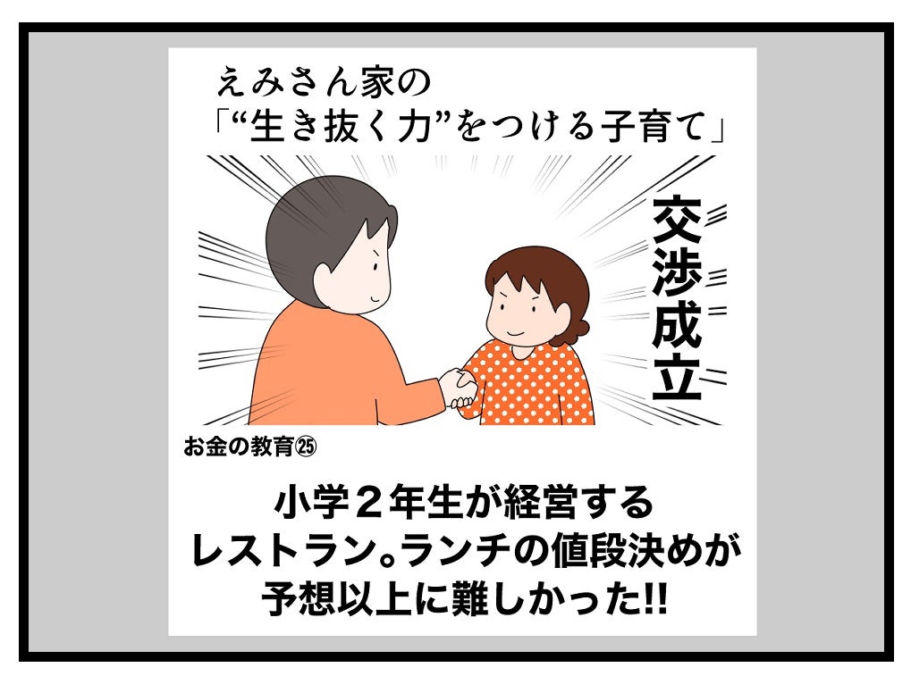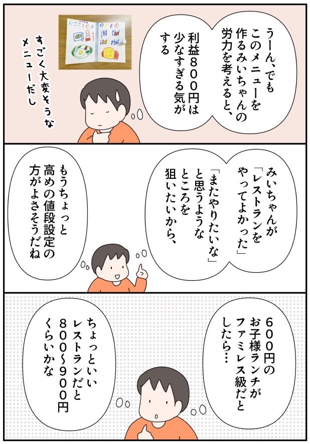 小学2年生が経営するレストラン。ランチの値段決めが予想以上に難しかった!! 2022.07.27 子育て いつも読んでいただき、有難うございます。 広告 ↓続きはこちら 小学2年生が経営するレストラン。ランチの値段決めが予想以上に難しかった!!(お金の教育㉕) – 共働きwith -講談社公式- 仕事も家庭もわたしらしく 我が家では「お金の教育」の一環として、長女みいちゃんが小学2年生の時、家庭内起業の「おうちレストラン」を始めることにしました。「おうちレストラン」とは、実際のレストランのように、子どもがメニューを考案し値段をつけてお家の人に売るというもの。レストランに必要な材料代や場所代などの経費は、子ども負担です。やる気満々で準備を進めるみいちゃん。材料代も判明し、いざラ…withonline.jp 0 コメントはこちら 同じカテゴリの記事 「家族で議論」がおもしろい! たたくなら… 何十年かぶりにプラネタリウムに行ったらとってもよかった話 「痛いの痛いの飛んでいけ」の効果的なやり方 国語の読解問題の採点でモヤモヤした話 その3 国語の読解問題の採点でモヤモヤした話 その2 国語の読解問題の採点でモヤモヤした話 その1 2歳児とお出かけ待ち時間に便利アイテム 心からオススメ!おうち勉強法の本 子どもが小学生になってまず覚えさせたこと 実録!小学生のいる共働き家庭の夏休みの過ごし方 その12 実録!小学生のいる共働き家庭の夏休みの過ごし方 その11 実録!小学生のいる共働き家庭の夏休みの過ごし方 その10 実録!小学生のいる共働き家庭の夏休みの過ごし方 その9 実録!小学生のいる共働き家庭の夏休みの過ごし方 その8 子どもの「ウソ」をやめさせたい!一発で効いた母の一言 実録!小学生のいる共働き家庭の夏休みの過ごし方 その7 実録!小学生のいる共働き家庭の夏休みの過ごし方 その6 実録!小学生のいる共働き家庭の夏休みの過ごし方 その5 小学2年生が1,000円のオムライスセットを販売!本物のお店も経営できる? 実録!小学生のいる共働き家庭の夏休みの過ごし方 その4 実録!小学生のいる共働き家庭の夏休みの過ごし方 その3 実録!小学生のいる共働き家庭の夏休みの過ごし方 その2 実録!小学生のいる共働き家庭の夏休みの過ごし方 その1 小学2年生がカフェに挑戦。ものすごく頑張ったのに利益ご少ない!? 算数とアスパラベーコン 英語を勉強する前に知っておきたかったことを子どもに伝えてみた話 その5 英語を勉強する前に知っておきたかったことを子どもに伝えてみた話 その4 小学2年生が家庭内起業で大儲け!小さな仕事は頑張らなくなる? 英語を勉強する前に知っておきたかったことを子どもに伝えてみた話 その3 英語を勉強する前に知っておきたかったことを子どもに伝えてみた話 その2 英語を勉強する前に知っておきたかったことを子どもに伝えてみた話 その1 家族で漢字検定を受検しました その7 小学2年生の家庭内起業。雇ったアルバイトが途中で逃げ出した!? 家族で漢字検定を受検しました その6 小学2年生が家庭内起業で初めて出した利益は1847円。客も店もみんなハッピーに! 家族で漢字検定を受検しました その5 家族で漢字検定を受検しました その4 家族で漢字検定を受検しました その3 小学2年生のおうち起業。7歳児が2時間半かけて一人で作ったランチが凄かった!(お金の教育26) 家族で漢字検定を受検しました その2 家族で漢字検定を受検しました その1 小学2年生が経営するレストラン。ランチの値段決めが予想以上に難しかった!! 空前の日本史ブーム到来!! 選挙の投票に子ども達と行った話 その4 選挙の投票に子ども達と行った話 その3 選挙の投票に子ども達と行った話 その2 小学2年生の家庭内起業。レストランのランチ価格がとんでもないことに!(お金の教育24) 選挙の投票に子ども達と行った話 その1 小学2年生が家庭内起業!!おうちレストラン、始めました(お金の教育23) 自主学ノートで楽しく学ぼう その5 自主学ノートで楽しく学ぼう その4 自主学ノートで楽しく学ぼう その3 小学2年生がおうちでレストラン経営にチャレンジ!? お金の教育22 自主学ノートで楽しく学ぼう その2 自主学ノートで楽しく学ぼう その1 忙しくてもイライラしても、愛が伝わる「魔法の言葉」(with online) キュンです!2歳児の言い間違い リビングで楽しく学ぶ地理 その3 ワーママ「ここぞ」の朝対応 その4 お金の教育21 学校斡旋の習字セットを買わないことで娘が学んだ「お金の使い方」 ワーママ「ここぞ」の朝対応 その3 ワーママ「ここぞ」の朝対応 その2 ワーママ「ここぞ」の朝対応 その1 お金の教育19 どうする⁉︎子どもの絵の具セット選び…大切なのは「自分で選択すること」だった 我が家のゲーセン事情 その3 我が家のゲーセン事情 その2 我が家のゲーセン事情 その1 お金の教育18 学校で使う絵の具セット「値段は妥当?」「親が買うのが当たり前?」 育休復帰の思わぬ壁 その16 育休復帰の思わぬ壁 その15 育休復帰の思わぬ壁 その14 育休復帰の思わぬ壁 その13 お金の教育17 大人でも難し