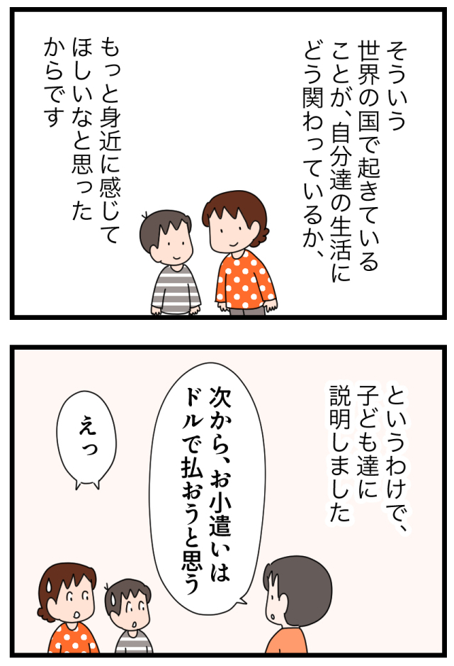 子のお小遣いをドル払いにしたら、世界がもっと身近になった! 2025.07.17 with記事 広告 ↓続きはこちらから読めます https://withonline.jp/with-class/education/emi_ikinuku/jJi4A?utm_source=instagram_stories&utm_medium=author&utm_campaign=20250718–emi_ikinuku 0 コメントはこちら 同じカテゴリの記事 親世代と違う「中学生の壁」がある!?小6のうちにあえて英語を先取りさせている理由とは 母が働くと子どもがかわいそう?フルタイムワーママが実践する、子との良好な関係の築き方 令和の小学生は夏休みの宿題が少なすぎ?任意の課題にも取り組ませた理由とは 小学生の友達付合い。スマホは与える?遊びのお金は?子の成長に繋がる選択とは 子育て中だからって諦めない!忙しくても最短で資格を取得する勉強法とは 子のお小遣いをドル払いにしたら、世界がもっと身近になった! 音読の宿題は、子が「要約力」を身につけ「自分の意見を持つ」機会 子が「気が利く人」になるには、この一言から もう無駄に悩まない!子育ての悩みを解決する鍵は「18歳の子の姿」にあった 「ある言葉」を伝えるだけで、子が自分で朝起きられるように。そのキーワードとは 送迎は無理。でも子の可能性を伸ばしたい!「オンライン習い事」をやってみた結果… 読書習慣は一生モノ!毎日、本を読む5歳児に親がした関わりとは 「あること」をするだけで、子の就寝時間が1時間も早まった!早寝の秘訣とは? 小学校入学前に「これだけはやっていてよかった」たった1つの習慣とは 学童のやめ時はいつ?子だけで留守番する時のルールは?我が家の場合… これぞマネー教育の成果!?お年玉で大金を手にした小学生が取った驚きの行動とは 学びと生活を結びつけて、子の好奇心を刺激する!家庭でできる簡単な工夫とは 子にかかるお金、どうしてる?何を節約して何にお金をかけるのか。我が家の場合… お年玉はお金の教育のチャンス!3年投資を続けた小5娘のお金の使い方とは 3人の子が、それぞれ充実した休日を過ごせる! 我が家の簡単ルールとは? 宿題を学校でやるのはOK?それともダメ?教育現場に見えた課題とは 子がダラダラ漫画を読むのをやめ、+αで頑張るようになった経緯とは 子の自立に必須なのが家事スキル!小学生がそれを身につけた方法とは 夫婦のすれ違いの原因は「言葉の解釈の違い」にあり!?相手を理解するのに必要なこととは 地頭が鍛えられる!幼児におすすめのボードゲーム3選 4歳児がお金を稼いで買い物に!?子の「あれ買って」はお金の教育を始めるチャンス 子供達だけで電車に乗せたら乗り換えに失敗!そのとき子供がとった行動は 無人島から帰ってきた子ども達に衝撃の変化が!夏休みの「挑戦」で得られた子の成長 子にマナーもビジネス感覚も教えるチャンス!外食の最大活用法とは 子の進路どうする?大学受験せずに進学できる方が幸せ?我が家の考えは 図鑑って必要?家に図鑑を置いたら子の能力が最大限引き出された話 子が充実した夏休みを送れるかのカギは「挑戦」と「成長」にあり 賢い子に育てたいなら「家族でボードゲーム」がおすすめの理由 子が小学校入学後スムーズに自立するか否かは、年長までの親の関わりで決まる! 最近、小学校が激変している! 一方で昔のやり方を謎に残す部分も…。令和の小学校の驚きの実態とは 子がゲームやYouTubeとほどよい距離感で付き合えるようになる3つのポイント 子が10歳までに身につけておいて本当によかった習慣ベスト5 「ちゃんと夫婦で話したいのに…」という時に効果あり!男性と会話する際の3つのポイントとは 夫に話しかけてもまともに会話にならない。その原因は、太古の「焚き火」にあった!? 家のことに無関心で協力しない夫。その意識を変える秘策とは 「俺は家族のために頑張ってる」「あなたは何もしてくれない」このすれ違いを生む男女の違いとは 家事も子育てもしない夫。実は男女の結婚観の違いに原因があった!? 子が自分の考えをうまく伝える力をつけるため、我が家が取り組んでいること 育休復帰後「時短勤務は中途半端だ」と悩んでいた時に救われた言葉とは 「授業がつまらない」を「勉強がつまらない」にしないために、家庭で取り組んだこととは ポテチ700円?水500円!?小学生の子供たちですら将来を考え直した、海外旅行での経験の衝撃度 親も子も、ついダラダラしがちな休日。休み明けに後悔しないための3つのルールとは 忙しいママの最強お役立ちアイテム!スマートスピーカーの子育て活用術とは 子どもが突然の発熱!?共働きで3児を育てる親が「まさか」に備えて実践している「3つの事前準備」 子供を保育園に預けて本当に大丈夫?保育園児の親が気をつけるべきたった一つのこと 初めての子供部屋。いいスタートのために親ができること 家の手伝いは工夫次第で「子どもの主体性を育む育児」になる! 最適なのは意外に難しい「食事の〇〇」 「親にやらされる」より「子が自分で目標を決める」方が圧倒的に頑張れる!結果が見える仕組みの作り方 しりとりに飽きたらこれ!子供も親も